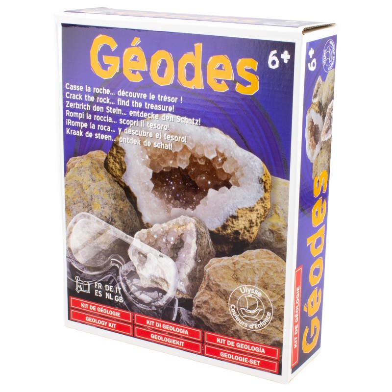 - Complete Set : 7 natural geodes, safety goggles, magnifying glass for close inspection, 2 display stands, and a multilingual guide (FR, GB, DE, IT, ES, NL).