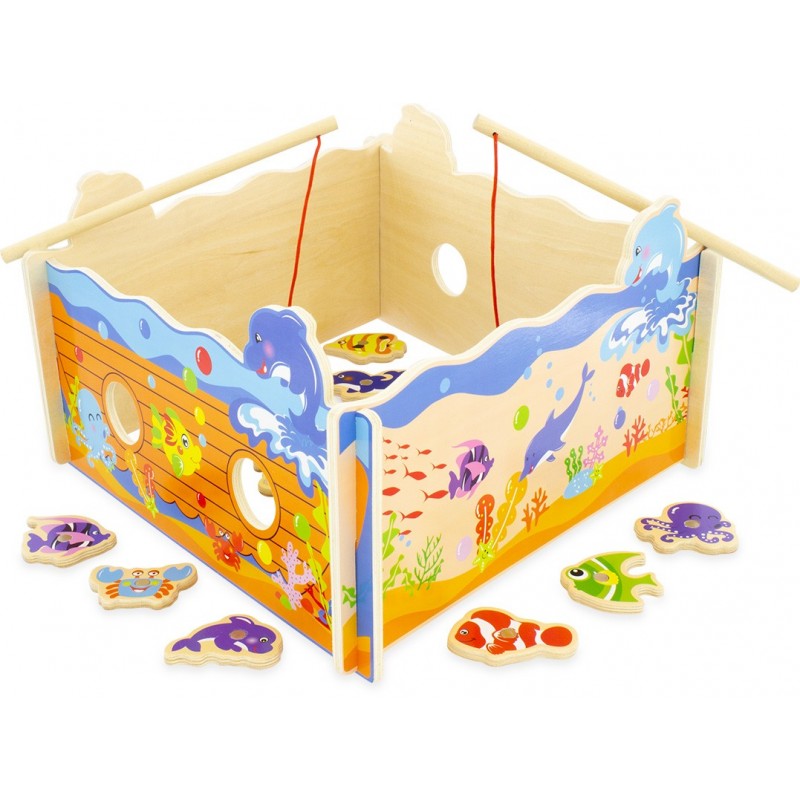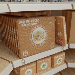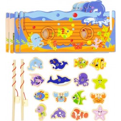 Introducing our Fishing Game, a captivating playtime activity for children! This game comes with 4 beautifully illustrated wooden boards that interlock to form the playing area. There are 16 wooden pieces featuring marine animals, all magnetized, making it easy for children to catch them using the two magnetic fishing rods included. The fishing rods are also magnetized at their ends, adding to the excitement of the game. Packaged in eco-friendly kraft cardboard, without plastic coating, this game offers an enjoyable and sustainable experience.