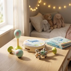 Introduce your little ones to the world of music with our wooden musical set including three instruments: a maraca, a tambourine, and a rattle with eight metal jingles. The tambourine is made of wood with a comfortable handle and three cymbals for fun sound effects. Suitable for children aged 18 months and older, this set is perfect for fostering their musical creativity while improving their coordination and fine motor skills. Made with high-quality and durable materials, this set is an ideal gift for young aspiring musicians.
