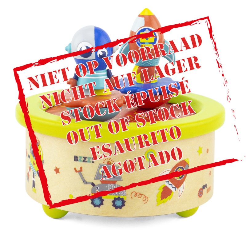 Offer your customers a nostalgic musical experience with our music box. Featuring the melody "Roman Hikō" by the band "Kome Kome Club," a rocket and robot begin to dance on the track as soon as the mechanism is wound. The key to wind the mechanism can be easily found under the box. This fun and stylish toy will be a perfect addition to any toy store for customers of all ages.